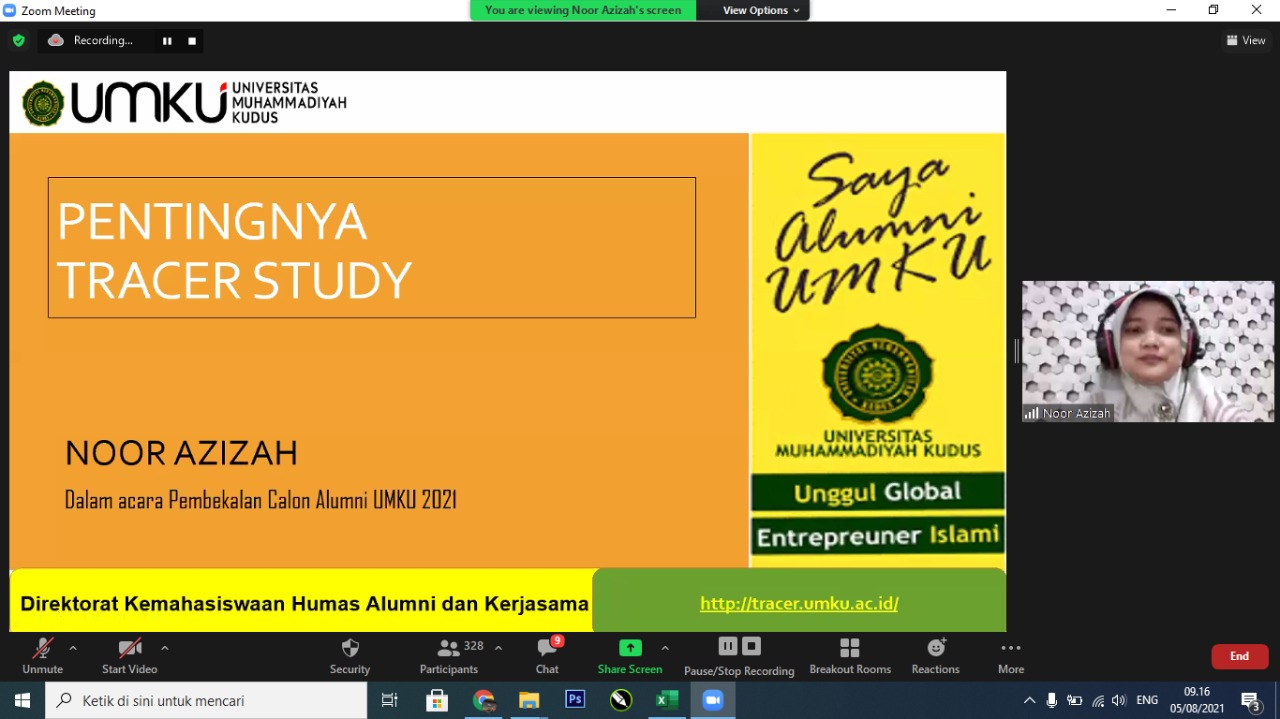 UMKU– Kamis, (5/08) Tim Pusat  Karir dan Tracer Study Universitas Muhamamdiyah Kudus mengadakan Sosialisasi Tracer Study dan Pembekalan Alumni Universitas Muhammadiyah Kudus via Zoom Meeting. Kegiatan yang dihadiri ratusan calon lulusan UMKU ini merupakan bagian dari rangkaian kegiatan yang diadakan untuk calon alumni UMKU guna membantu pengembangan karir mahasiswa saat menjadi lulusan.